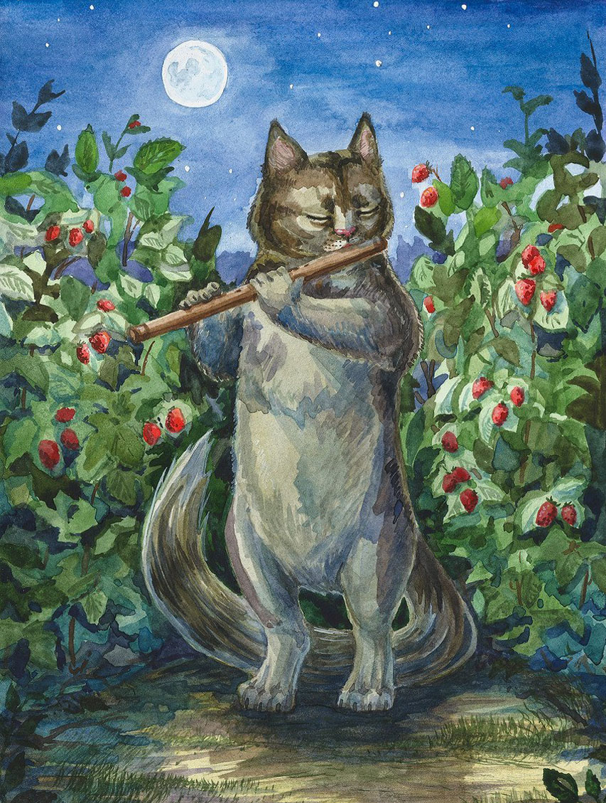 На исходе лета, в сумерках долины Кот играл на флейте в зарослях малины. В синеве безбрежной, в глубине хрустальной Пела флейта нежно, тихо и печально. И луна, качаясь в небесах высоко, На кота взирала благосклонным оком.